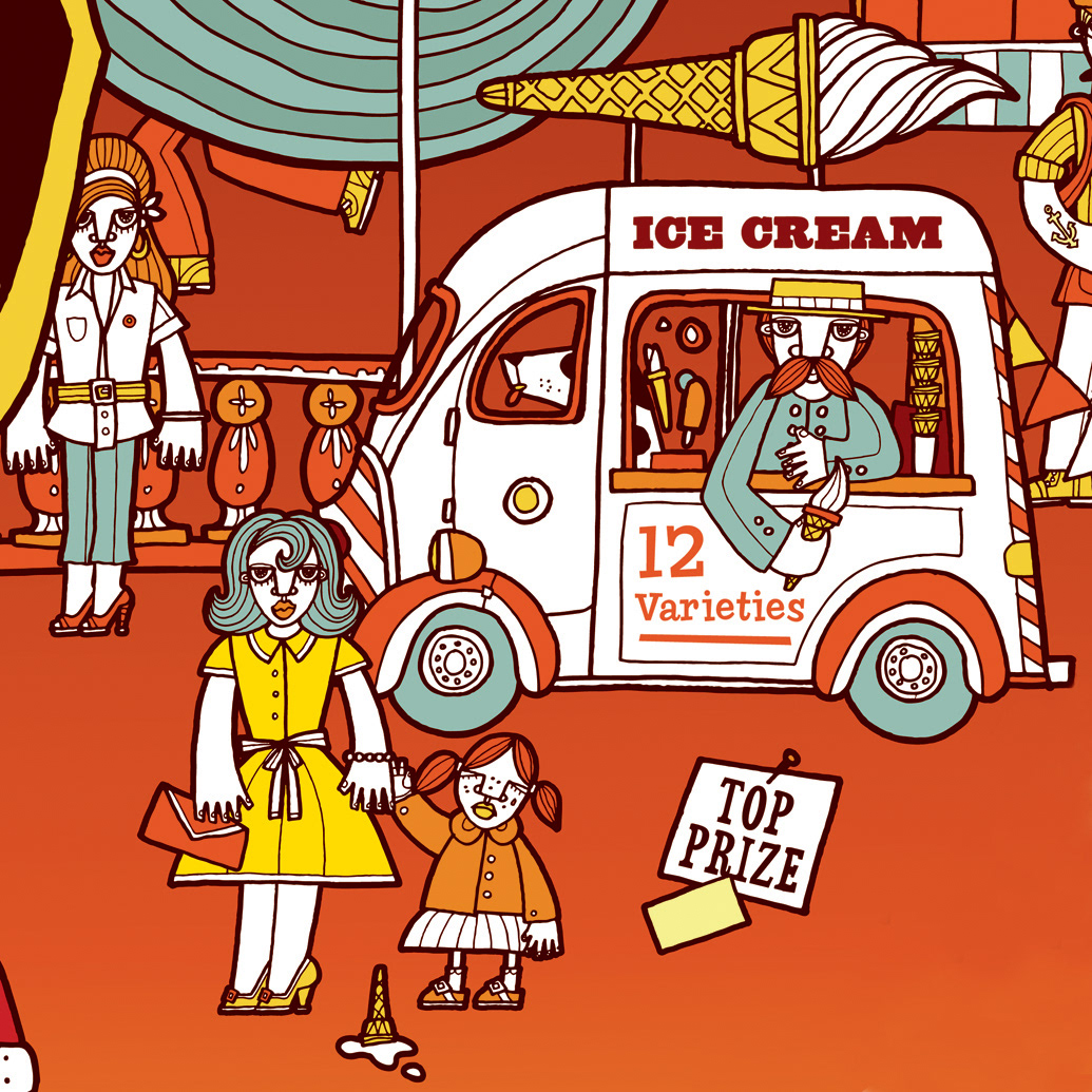 This personal piece is a 1950's inspired fairground crammed full of characters including fortune teller, texan tourist & italian ice cream vendor not to mention all the retro rides & all the fun of the fair! As it's pretty big & busy I've included some detailed shots to give you a close up view... I'll be selling this as a large scale print in my shop too!