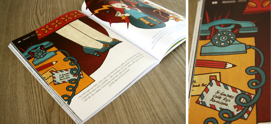Ten page double spread illustrating the short story 'Supolé' by Eloïse Lièvre. The story features in design led kids publication Bonbek & follows the adventures of a little girl 'Soupolé' who wonders why she is named after 'milk soup' & the adventure she goes on to find out. The 'magazine' is printed in both French & English.
