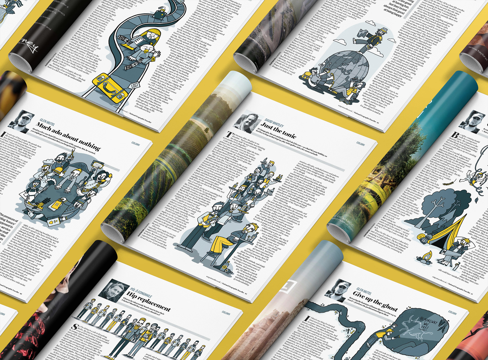 Editorial illustrations for National Geographic's Traveller & Family magazines. Various themes for the columns' topics ranging from loosing your kids in the airport to hating the overly helpfulness of staff in luxury hotels, thinking you've discovered a new place when you havn't & cocktails of the world. Illustrations to accompany a range of articles by different writers but always using the refined colour palette of blues, greys & yellow.